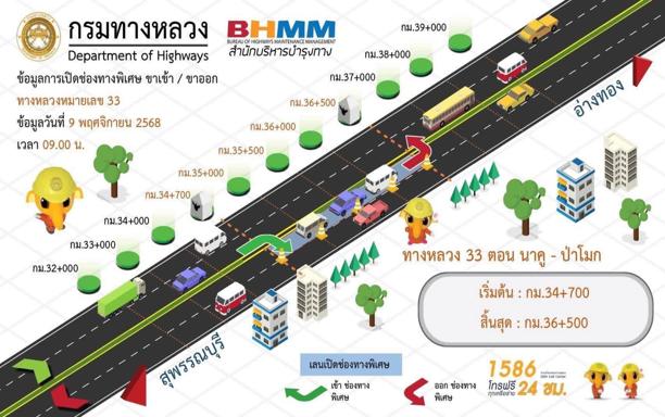 ประชาสัมพันธ์ให้ทราบ ปิดถนน! ไม่ไหวอย่าฝืน ถนนสาย 33 เส้นทางเข้าหมู่บ้านทำกลอง ตั้งแต่ลงสะพานป่าโมก ห้ามรถทุกชนิดวิ่งตรงไป