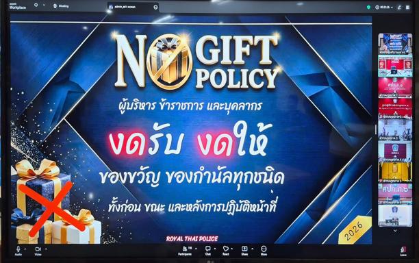 โดย ผบช.ภ.1 และผู้เข้าร่วมประชุม ได้เข้าร่วมประกาศเจตนารมณ์ไม่รับของขวัญและของกำนัลทุกชนิด( No Gift Policy )