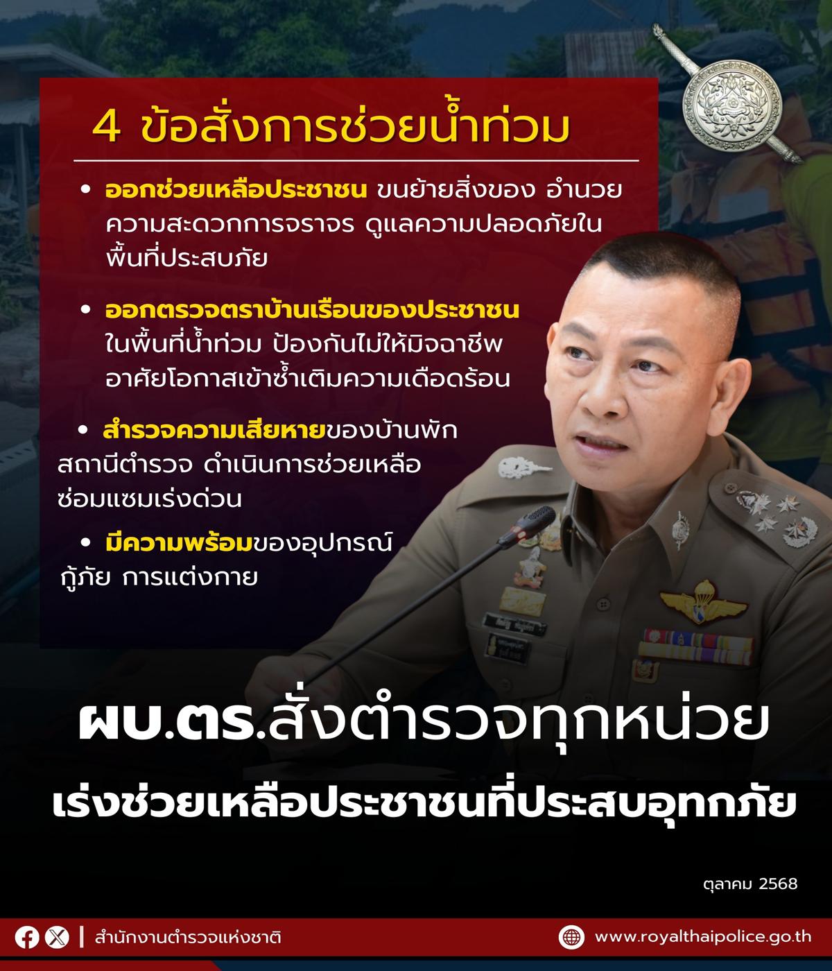 ผบ.ตร.สั่งการ 4 ข้อ ให้ตำรวจทุกหน่วยเร่งช่วยเหลือประชาชนที่ประสบอุทกภัย
